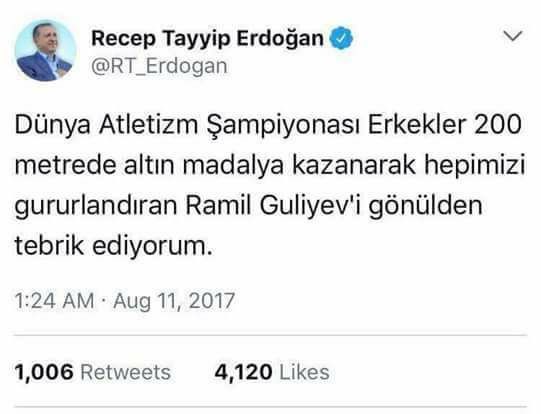 “Atletika üzrə dünya çempionatında kişilər arasında 200 metr məsafəyə yarışda qızıl medal qazanaraq hamımızı qürurlandıran Ramil Quliyevi könüldən təbrik edirəm”.