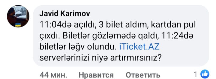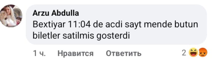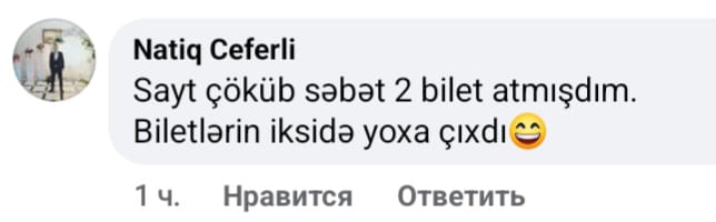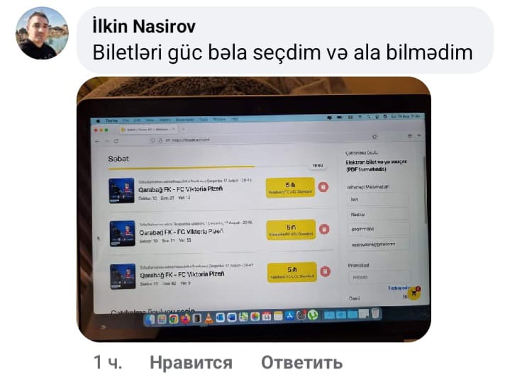 Satış başlayandan 10-15 dəqiqə sonra azarkeşlər sosial şəbəkə hesablarında üsyan edirdi. Biri pul çıxıldığı halda biletə sahib olmadığı yazır, o biri 5 manatlıq biletlərin tükəndiyini qeyd edir, bir başqası hesabından pul çıxıldığını, sonradan geri qaytarıldığını söyləyərək biletsiz qaldığını bildirirdi.