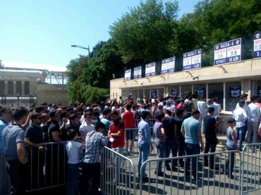 Havanın isti və günəşli olmasına baxmayaraq, yüzlərlə azarkeş "Qarabağ"a dəstək olmaq üçün, səhər saatlarından kassaların önündə növbə tutub. Saat 10:00-da açılan kassalarda, bir nəfərə maksimum 3 bilet satılır.