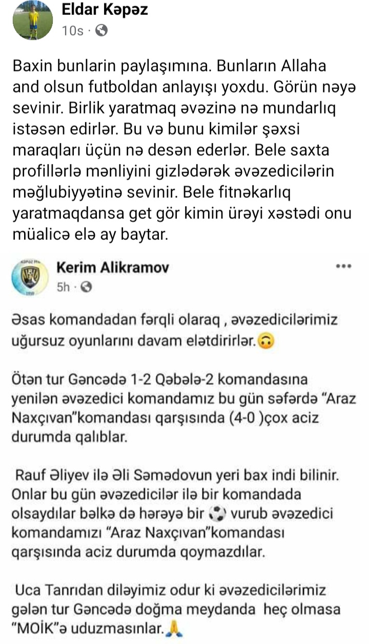 Onun istehzalı paylaşımına Eldar adlı fanatdan sərt reaksiya gəlib. O, Kerimi saxtakarlıqda, fitnə salmaqda günahlandırıb.
