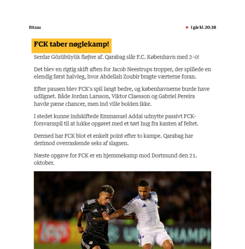 "Oktyabrın 1-də keçirilən görüşdə "Kopenhagen" xüsusilə birinci hissədə ciddi problemlər yaşadı. Ümumilikdə 8 matç oynayacaq paytaxt klubunun 2 oyundan sonra hedabında cəmi 1 xalı var".