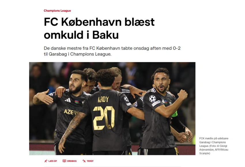 "DR Nyheder"də isə "Kopenhagen" Bakıda darmadağın edildi" başlığı ilə yazı çıxıb: