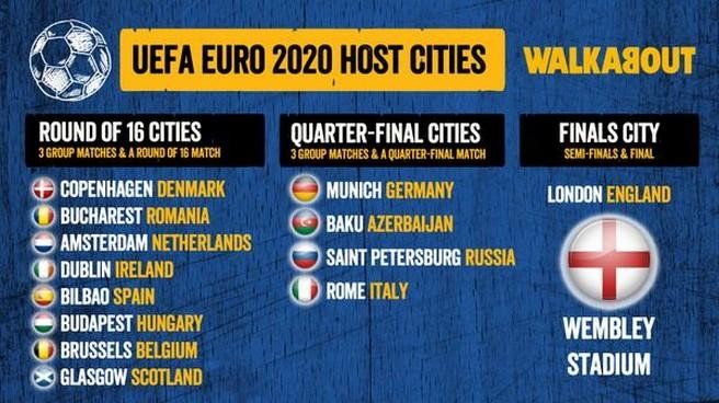 AVRO-2020 qitənin 12 şəhərində - Bakı (Azərbaycan), London (İngiltərə), Münhen (Almaniya), Sankt-Peterburq (Rusiya), Roma (İtaliya), Kopenhagen (Danimarka), Buxarest (Rumıniya), Amsterdam (Hollandiya), Dublin (İrlandiya), Bilbao (İspaniya), Budapeşt (Macarıstan) və Qlazqoda (Şotlandiya) təşkil olunacaq. Bakıda A qrupunun 3 oyunu ilə yanaşı, 1/4 final matçlarından 1-i keçiriləcək.