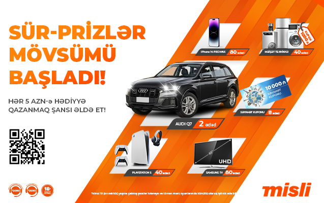 İki ay davam edəcək lotereyada ümumilikdə 8 ədəd 10 min manat dəyərində səyahət kuponu, 80 “iPhone 14 Pro Max”, 80 televizor, 40 “PlayStation 5”, 40 ədəd elektronika mağazasından 1000 manat dəyərində alış-veriş kartı və ən əsası 2 ədəd “Audi Q7 Comfort Plus” avtomobili sahiblərini gözləyəcək.