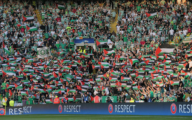 Görüşdə “Seltik”in azarkeş qrupu böyük bir Fələstin bayrağını tribunaya qaldırıb, həmçinin digər tribunalarda da bir neçə bayraq yerləşdirilib.