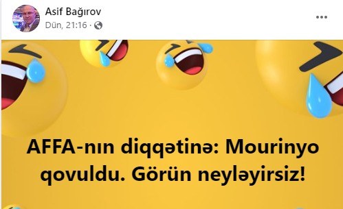 O, federasiyaya Joze Mourinyonu məsləhət görüb: "AFFA-nın diqqətinə: Mourinyo qovuldu. Görün neyləyirsiz!"