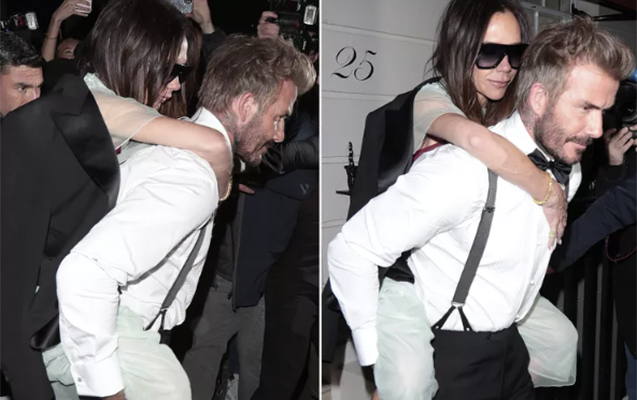 Bundan öncə idman edərkən ayağını zədələyən modelyer restoranın girişində iki qoltuq dəyənəyi ilə görünsə də, gecənin sonunda buna ehtiyac duymayıb. Buna görə də onu Bekhem kürəyində maşınına aparıb.