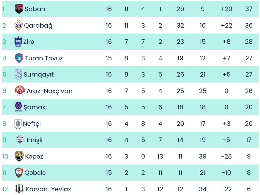 Hər iki klub 27 xala malikdir. Rəqibindən bir oyun az keçirən "Turan Tovuz" dördüncü, "Sumqayıt" isə beşincidir.