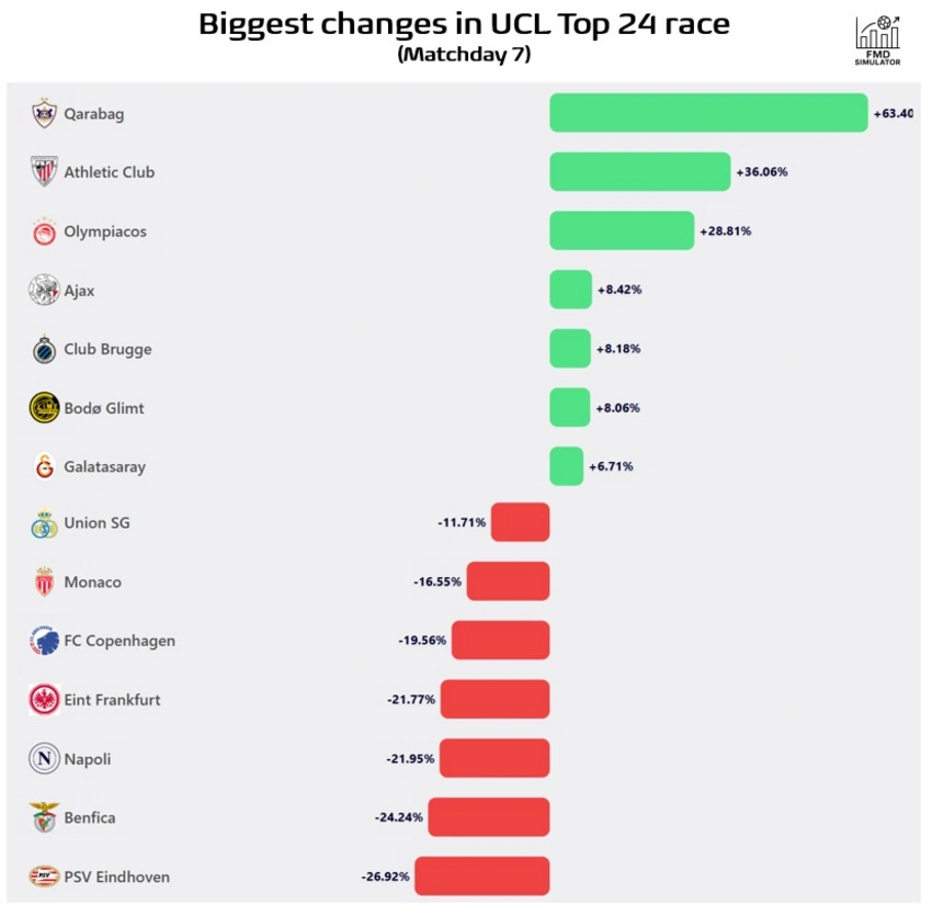 "Qarabağ" "Liverpul"a uduzsa belə, pley-off şansı yüksəkdir. Yalnız 9 kollektivin "köhlən atlar"a çatmaq ehtimalı var. Bunlar 19-cu sıradakı "Marsel" (Fransa, 9 xal), 20-ci yerdəki "Bayer 04" (Almaniya, 9 xal), 21-ci mövqedəki "Monako" (Fransa, 9 xal), 22-ci pillədəki PSV (Niderland, 8 xal), 23-cü olan "Atletik" (8 xal), 24-cü "Olimpiakos" (Yunanıstan, 8 xal), 25-ci "Napoli" (İtaliya, 8 xal), 26-cı "Kopenhagen" (Danimarka, 8 xal) və 27-ci "Brügge"dir (Belçika, 7 xal).
