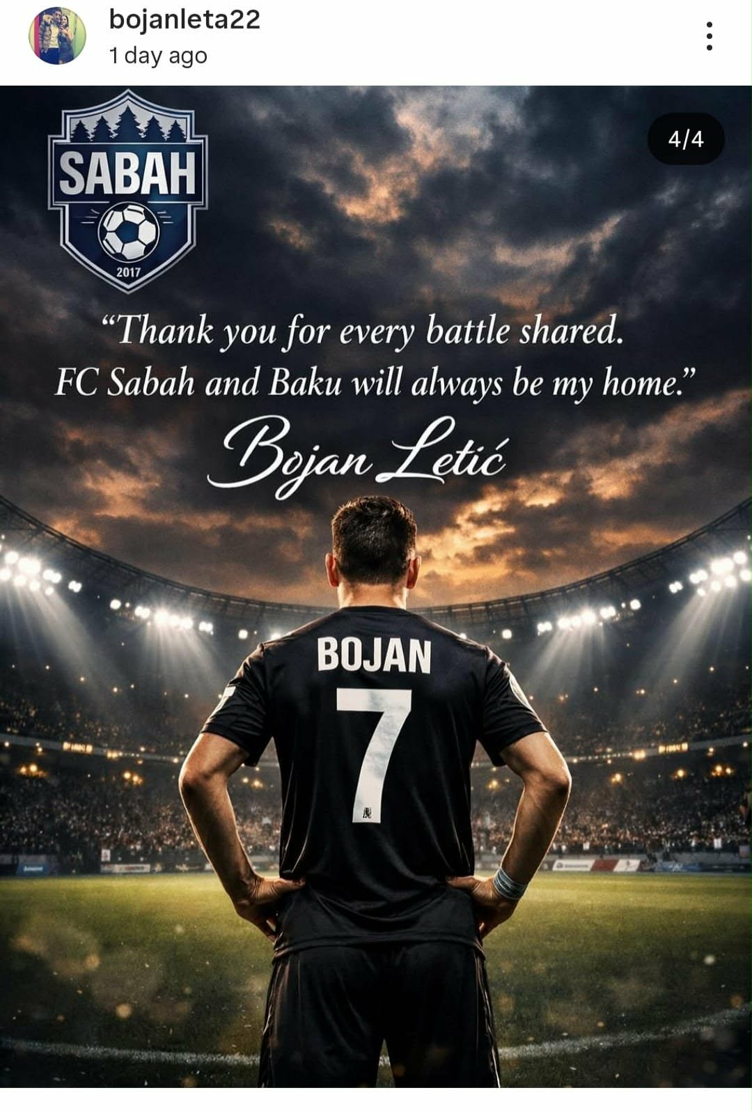 Bir müddət öncə “Sabah”dan ayrılan bosniya və herseqovinalı müdafiəçi Boyan Letiç kluba təşəkkür edib.