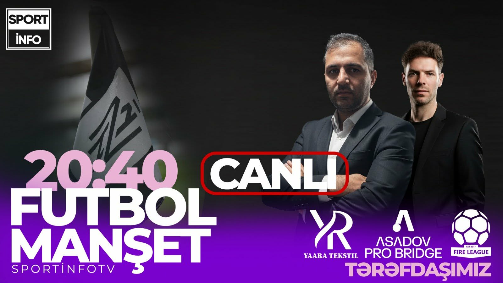 Əziz izləyicilərimiz, verilişimiz öz zövqlü geyimləri ilə minlərlə peşəkar və həvəskar idmançılarımızı təmin edən, onların sevimlisi olan “YaaRa Tekstil”in və “Asadov Pro Bridge”in - beynəlxalq təcrübə prinsipləri üzərində qurulmuş FIFA lisenziyalı futbol agentliyinin dəstəyi ilə təqdim olunur.
