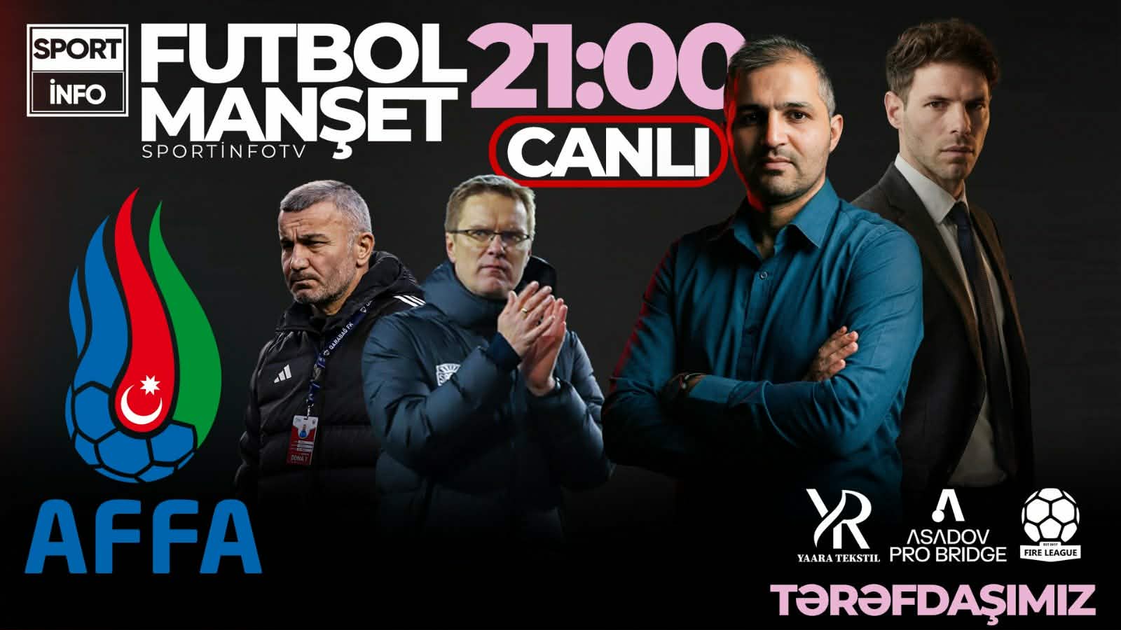 Əziz izləyicilərimiz, verilişimiz öz zövqlü geyimləri ilə minlərlə peşəkar və həvəskar idmançılarımızı təmin edə onların sevimlisi olan “YaaRa Tekstil”in və “Asadov Pro Bridge”in - beynəlxalq təcrübə prinsipləri üzərində qurulmuş FIFA lisenziyalı futbol agentliyinin dəstəyi ilə təqdim olunur.