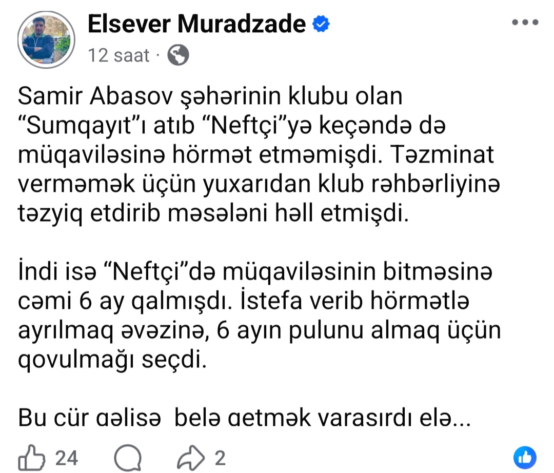 O, idman jurnalisti Elsəvər Muradzadənin sosial şəbəkə hesabından yazdığı postu bəyənməklə Abasovu hələ də unutmadığını göstərmiş olub.